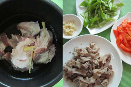 1.隔山肉漂洗干净,用剪刀剪掉表面上白色的肥油。将处理干净的隔山肉放入电饭煲,兑入足量清水没过肉,加入姜丝和料酒,加盖,煮10分钟。10分钟后,取出煮好的隔山肉,用清水冲洗掉浮沫,切成小块。胡萝卜洗净,削掉外皮,切小片,青椒洗净去籽切块,大蒜去皮切粒。