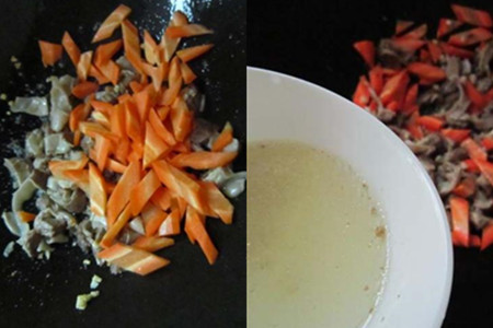 3.炒香之后,将胡萝卜片加入锅中,翻炒几下,再烹入少许高汤,加盖焖煮。