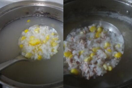 接着我们将米用清水淘好,取出一口干净的锅,将洗好的米放入锅中,再往锅中加入适量的水。然后我们将锅的锅盖盖上,先用大火将锅中煮开,然后将大火调成小火将米熬成粥,接着我们在锅中放入之前剁好的猪肉,将它们搅拌均匀,稍微的将锅中煮两分钟之后,我们在将胡萝卜和玉米放入锅中,将锅的锅盖再次盖上,等待锅中的所有食材煮熟。