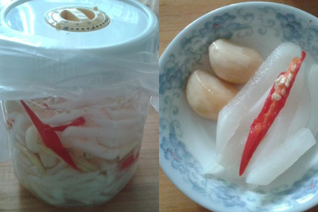 第四, 把拌好的萝卜装入密封的容器里,注入足量的凉白开,密封好后放入冰箱,约两天后即可取出食用。
