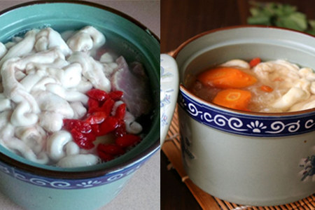 第四, 取一个炖盅,放入银耳、胡萝卜、瘦肉、骨髓、姜片、枸杞,注入足量的清水,调入少许料酒,隔水蒸约45min。起锅前入盐调味即可。