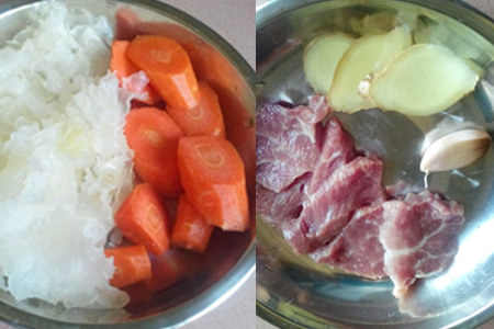 第二, 银耳提前泡发,然后切成小朵;胡萝卜洗净削皮,切成小块;瘦肉洗净切片;生姜切片。