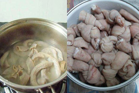 2、将猪小肠放在沸水中煮开,还要在其中加入一些料酒,这样能让小肠变得细腻又有筋道。之后朋友们就可以将四条左右的小肠组成一束,然后再用一根小肠将其缠绕起来。缠绕的时候一定要用劲,这样肠卷才会比较紧凑,切的时候也不会散开。