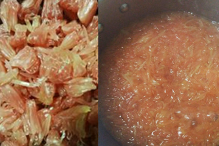 柚子皮切成条之后,然后放在碗里,撒一些精盐腌一会儿就不难么苦了,而且还可以化痰。然后我们把剩下的果肉用手掰开,尽量掰的碎一些。取出不粘锅,把柚子果肉以及柚子皮放进去,加适量的冰糖和一碗水,用大火煮开后小伙慢炖。等到煮半个小时后,柚子就会变得浓稠了,汤汁的颜色也变成亮黄色了。