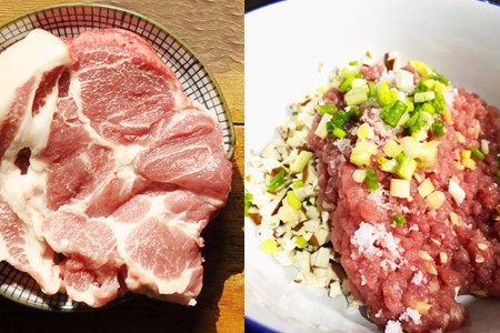 Step1:选择肥瘦相间的猪肉,然后用盐水洗干净。把猪皮去掉,顺着猪肉的纹理先切片,再切成粒状。然后用刀背把猪肉粒剁成沫状。葱切成葱末,姜切丝备用。用碗把猪肉末装起来,把葱末、姜末放进去,然后放入适量的料酒、酱油、生粉、盐腌制半小时以上。