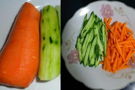 Step2:把买回来的胡萝卜洗干净,削皮然后切成丝状。在锅内放入适量的水,放点盐煮开。然后把胡萝卜丝放进去焯下水。青瓜洗干净,削皮切丝备用。