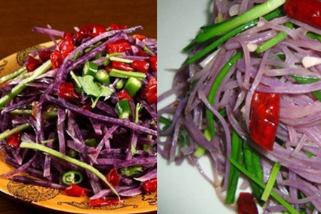 菜谱一:凉拌紫土豆丝。这款菜需要的材料包括:紫土豆、油、盐、花椒、干辣椒、芝麻菜、糖、蒜蓉和醋。凉拌是一种健康的烹饪方式,未经烹煮的紫土豆保持着原有的营养成分。凉拌帮助减少食物油的摄入,降低肠胃的消化负担。所以,凉拌成为新时代的白领人士很喜欢的做菜方式。这款凉拌紫土豆怎么做呢?