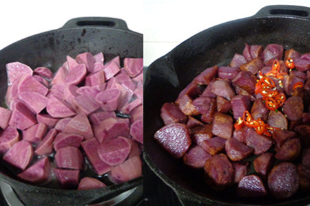 菜谱二:香煎紫土豆。做香煎紫土豆需要这些材料:紫土豆、油、盐、红辣椒、孜然粉、小葱、白糖、白芝麻。经过热油煎制的紫土豆更有香气,吃起来外脆里软,可以当成是小孩子的零食。宝爸宝妈可以自己在家给自己的孩子做这款香煎紫土豆,比在外面买各种充气零食、色素零食要健康得多。紫土豆软糯香甜,一定会很受小孩子喜爱。