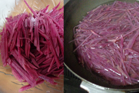 (2)将切好的紫土豆丝放入清水中冲洗,这样能够去除多余的淀粉。