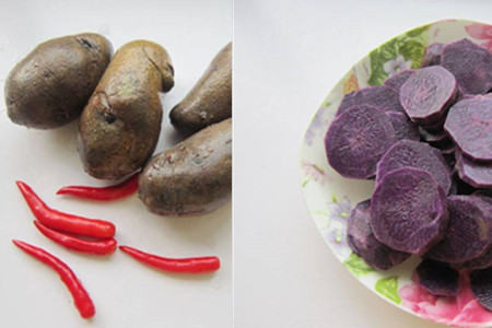 做法:(1)先将紫土豆削皮,洗干净后切成片。
