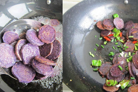 菜谱三:香辣紫土豆片。做这款菜的材料包括:紫土豆、植物油、盐、生抽、姜、花椒粒、香葱、鸡精、小米椒、青辣椒。如果你很喜欢吃辛辣食物,那不妨试试这款香辣土豆片。土豆片本就具备香甜的口感,加上辣椒的辣性,相信会很符合你的口味。土豆片含有丰富的淀粉,能够提高人体机能日常运转所需要的能量。所以,香辣紫土豆片是一款营养满满的菜。