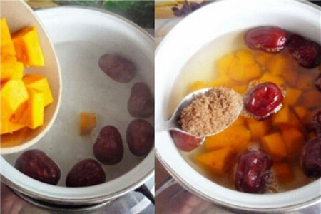 step5,通常来说煮红枣的时间控制在二十分钟内即可,然后我们再加入南瓜,因为南瓜本身就带有一点甜味,所以我们加入南瓜之后暂时不要加入红糖。