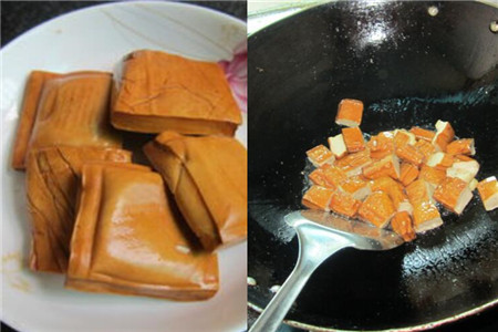 步骤1,首先要把新鲜的豆干放在盐水里面洗一下,然后把豆干切成小块就可以了。