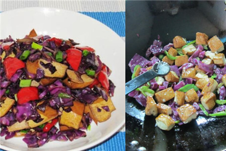 步骤3,我们把豆干炒得差不多的时候,就把我们已经切好之后的紫包菜倒在锅里面,然后继续翻炒,只需要把紫包菜炒熟了之后就可以一起过锅。我们可以适当的在紫包菜放一点生抽,因为这样可以让豆干的颜色看起来更加的漂亮一些。