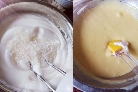 加了蛋黄的面粉里还需要放牛奶,牛奶可以是蛋糕更加香醇,我们平时买的蛋糕里也会加奶粉或者炼乳,虽然味道很好吃,但是热量在无形中会增加很多,不如加一些牛奶比较健康。做好的蛋清里可以加一些柠檬汁,然后把面糊倒进去,搅拌均匀之后,我们就可以把面糊倒进磨具里面了。