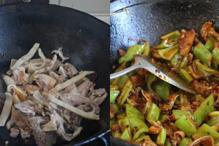 炒锅洗净上灶,放油烧热,加入适量豆瓣酱煸炒。豆瓣酱炒出香味之后,将切好的羊头肉片下锅,旺火翻炒。接着,加入青椒块和干辣椒,继续翻炒。青椒块炒至发焉时,烹入适量酱油,再大火炒30秒即可起锅。