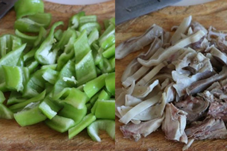 辣椒清洗干净,去掉辣椒籽,切成小段。熟羊头肉切成小片。