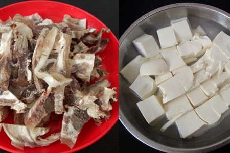 熟羊头肉切成小块。豆腐切小块,放入开水中泡一下,去掉一些豆腥味。青蒜清洗干净,蒜白和蒜苗分别切碎。