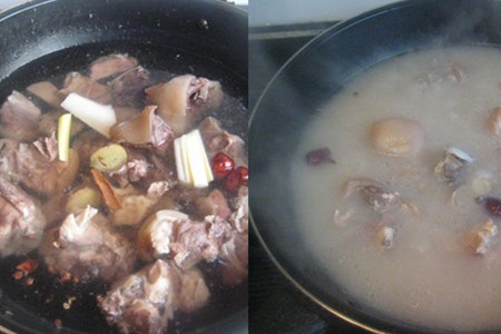 第三, 待到汤汁熬成微微乳白色时候,捞起桂皮、八角等佐料,以免影响口感,然后调入胡椒粉和盐搅拌均匀。