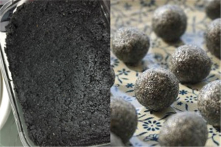 然后把黑芝麻放入锅中炒熟,锅中不加任何东西,待温度升高后直接倒入黑芝麻翻炒即可,炒熟爆出香味后盛出,用机器打成粉末状,装进盘子里备用,图方便的话也可以直接买现成的黑芝麻粉。