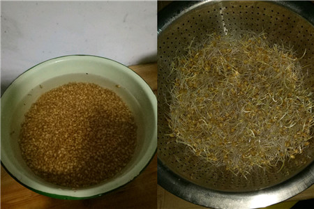 准备麦种,用清水浸泡一晚后沥干水分放在铺有厨房纸巾的盘子上,找个阴暗角落放置发芽,一定要注意避光,否则味道就不纯正了。每天喷两次水,耐心等待一周左右,然后把发的芽剪下洗干净。