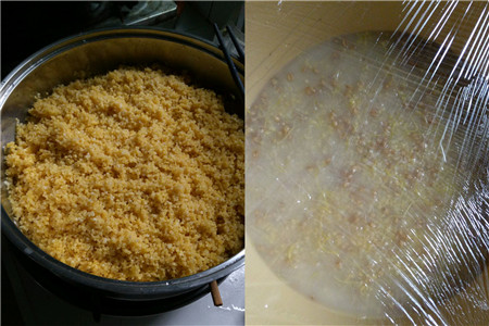 用擀面杖之类的工具把芽碾碎,提前一晚浸泡小米,之后小米蒸熟弄散晾到不烫手时,加入比例为小米量四分之一的麦芽,再倒入适量的清水没过即可,搅拌均匀后用保鲜膜封住发酵五个小时。