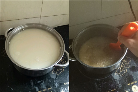 发酵好后用纱布过滤汁水,倒入锅中煮开,以便把水分蒸发掉,看到锅中液体呈现出黄色并变粘稠就改用小火熬煮,用工具辅助搅拌防止粘锅,要一边熬一边搅拌。