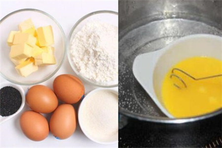 首先,准备好做芝麻薄饼的材料,黄油、鸡蛋、面粉、白砂糖、芝麻缺一不可。材料都准备好了之后,第二步就是融化黄油,将锅内水烧热,之后将黄油放在碗中,隔水加热,使其融化。
