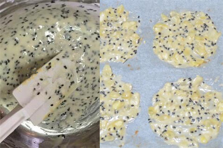 搅拌成均匀浓稠的芝麻面糊之后,之后找来烤盘,铺上烤纸,用工具将搅拌好的面糊铺在烤纸上,铺的时候记得要留一点空间,以免烤好了之后出现粘连的现象。