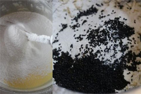 过滤的细面粉,倒入搅拌好的黄油蛋液中,同时加入芝麻,再次进行搅拌。