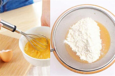 黄油融化了以后,再将鸡蛋液和白糖一起倒入融化好的黄油中,再用打蛋器将其搅拌均匀,这个过程比较耗费时间,嫌麻烦的可以买电动的搅蛋器。搅拌均匀之后找来滤网,将面粉过滤。