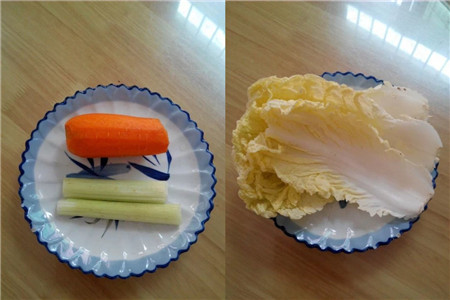 蔬菜饼当然少不了蔬菜,原材料没有特定的要求,按照自己喜欢的蔬菜加进去就可以了。这里准备的是半个胡萝卜、一根西芹和几片娃娃菜。洗干净后把它们切成碎丁,尽量切细一点,方便混合。