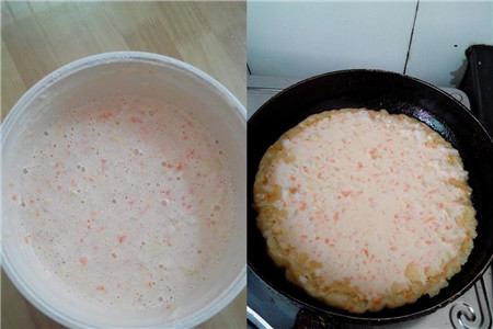 开始倒入一点清水慢慢搅拌,然后一边搅拌一边倒水,待看到面糊稀释到不浓稠但也不至于太稀时就可以了。这时将平底锅烧热,倒入油,看到油冒白烟后缓慢倒进面糊,摇动锅让它均匀摊开。