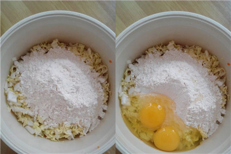 然后找个大一点的盆子,把所有材料都倒进去,再加入面粉,还可以加两个鸡蛋,这样做出来口感更具有层次感,更好吃。之后按照自己的口味加入适量的食盐、白糖、胡椒粉,加完调料后搅拌。