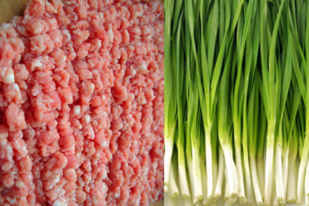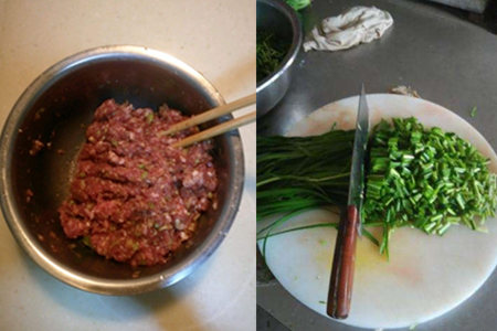 葱姜要提前切好,猪肉切成肉末加入调味料,搅拌好之后的猪肉腌制几分钟。多搅拌几下猪肉这样可以增加猪肉的口感。韭菜要提前洗干净,韭菜洗干净后晾干,再切成小段。