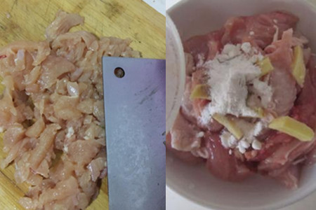 鸡肉购买的时候不要买冷冻的,要买冷鲜的,这样我们在切的时候比较容易,能够减少烹饪时间。鸡肉事先拍打一会儿,这样腌肉的时候能够快速入味,肉质也会变软一些。