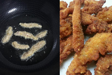 锅内倒入适量的食用油,加热至八层左右,打一个鸡蛋放在碗里,之后用蛋液搅拌鸡肉。用筷子夹取放进锅里,炸至金黄色就可以取出了,然后撒一些孜然粉在上面就可以了。这种食物热量比较高,我们还是少吃为宜。