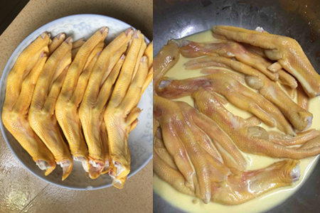鸭掌处理好后就可以放在一边晾干了。鸭掌晾干后,大家就可以在鸭掌上撒上玉米淀粉、木薯粉、白砂糖以及食用盐搅拌均匀了。搅拌好后就可以在里面加入白开水,把鸭掌浸泡大概二十分钟。