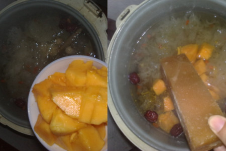 半个小时之后,我们在往锅中放入之前准备好的木瓜、银耳和百合,将锅中的食材搅拌均匀,将锅盖盖上再煮十分钟,十分钟之后,我们将锅盖打开,在锅中加入适量的红糖,注意在放入红糖的时候,我们要一边放入红糖一边用勺子将锅中进行搅拌,以防止红糖粘在锅内,这样会影响做出来的糖水的口感。也可以将红糖换成冰糖加入锅中。