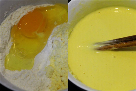 首先准备面粉和玉米粉,比例按照自己的喜好加,喜欢玉米味浓一点就可以多加一点,这里的比例是1:1,然后在其中打入一两个鸡蛋,可以使口感更好更松软,倒入清水用工具稀释搅拌,尽量搅拌得细一点没有颗粒,做成液体糊状就可以了。