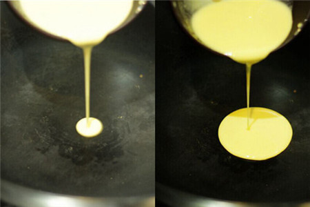 开小火将平底锅烧热,锅中不放油保持干燥,缓慢倒入一点玉米糊,不要一次性倒太多,太厚的话会导致中间煎不熟外面却焦了的情况,然后晃动平底锅,让它均匀摊开。