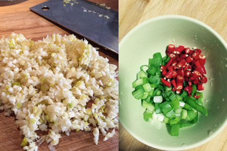 第三, 大蒜剁成蒜末、小米椒切小段,香葱成葱花,粉丝提前浸泡至软。