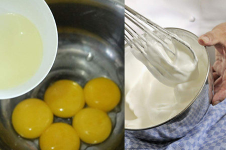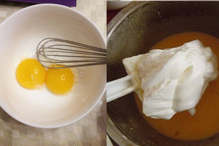 然后在蛋黄里放入两勺子的白砂糖以及三勺子的面粉搅拌均匀。搅拌均匀后再加入六勺的牛奶继续搅拌。这个时候就可以在里面加入刚刚打好的蛋清,要注意的是这个时候不要用太大的力去搅拌,而是用大勺子慢慢翻动,把蛋黄和蛋清拌均匀。