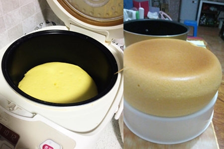 这个时候就可以把电饭煲加油预热。电饭煲预热好后,就可以倒入蛋糕液。等电饭煲煮好之后,蛋糕就成型了。