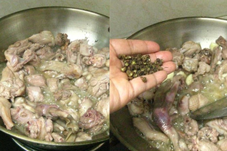 炒锅置于灶上,倒入适量油,油热之后,将滤干的鸭肉倒进锅中,反复翻炒。鸭肉翻炒至无血色后,将切好的蒜片下锅,再加入1小把花椒粒,继续翻炒。