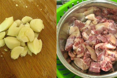 蒜瓣剥皮切成大块。鸭肉清洗赶紧,斩成块状,滤干水分待用。