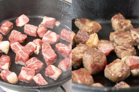 炒锅洗净上灶,不放油,开大火烧至冒青烟,将切好的牛肉粒下锅煎制。牛肉粒煎至四面微微变焦,盛出锅待用。