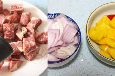 往牛肉粒表面上撒上适量黑胡椒粉和盐,用手将调料抓匀,置于一边腌制20分钟。洋葱和彩椒洗净,全部切成和牛肉粒大小差不多的块状。