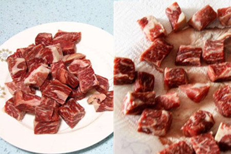 雪花牛小排提前解冻,切成小丁,将表面的水分擦干。