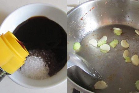 准备一个小碗,碗中加入适量白糖、香醋和料酒,搅匀制成碗汁待用。平底锅重新放少许油烧热,将姜片下锅煸炒。